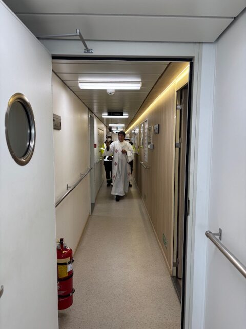 7階建てのビルのような巨大な船から縄梯子が下ろされ、船の側面に固定された。こちらの船もあちらのコンテナ船もかなり揺れている。縄梯子によじ登るのも容易でなかったが、4人は無事BAALBECK号に乗船し、フランス人の航海士に迎えられて上階へと案内された。三層程上がったデッキにランディー氏の遺体が寝かされ、19人のフィリピン人と2人のフランス人が整列していた。洋上の強い風の中、静かに検死がはじまった。数分で「心臓発作です。間違いありません」ドクターの確認が終わり、私の出番が来た。遺体に灌水し、額と胸に十字架を切り、私の後ろに立っているフィリピンの船員たちに囁いた。「主の祈りを唱えようか」皆が頷き、タガログ語で主の祈りを歌った。