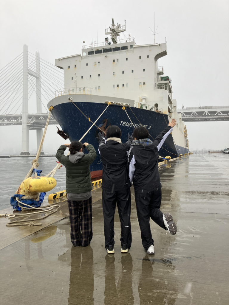 結果的に大黒DT−5埠頭のMORNING MENAD号、韓国籍24名のフィリピン船員の自動車専用運搬船の荷役が終わる寸前に生徒達も雪の中ランプウエイを上って4−5名のクルーに自分たちで作ったプレゼントを渡すことができました。