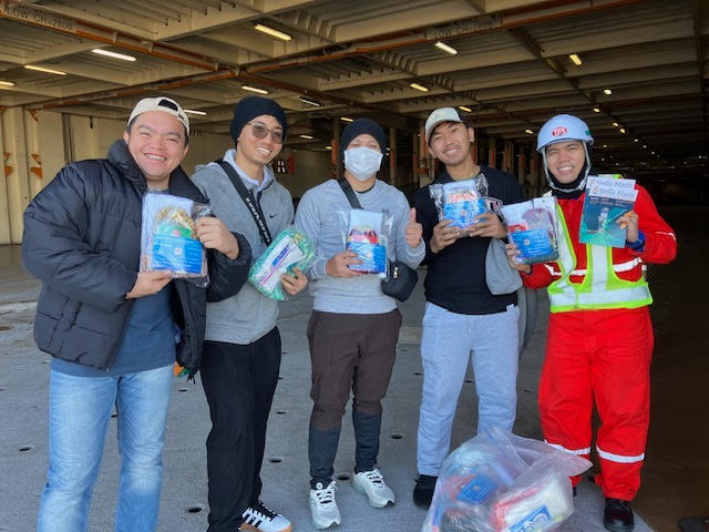 3. TRANS HARMONY 1号: DT-3, 自動車運搬船、パナマ籍、25名、フィリピン人。訪船時タクシーで外出する写真の若い船員達とすれ違いました。次回はタイミングが合えばSMで送迎すると伝えました。