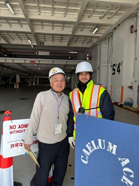 こちらはLNGを燃料に使う最新鋭自動車運搬船です。通常の重油燃料の船よりCo2やSO2の排出が低く環境に優しい船です。シンガポールに主に新車を運ぶとのこと。ただ11台だけ中古車を積んでるそうです。
