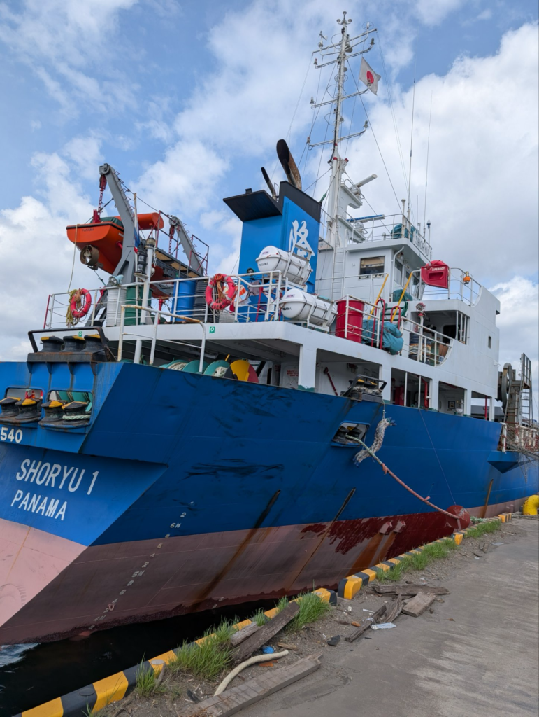 ミャンマーの若い船員さんが出迎えてくださいました。これから韓国に行くそうです。12個のプレゼントをお渡ししました。 無事の航海をお祈りしました。